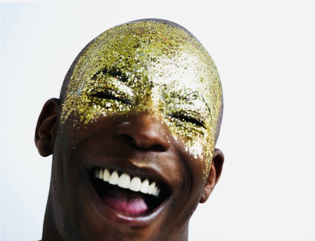Senare, på middagen, hamnade jag vid ett bord med en av alla oglittrade män, o jag undrade försiktigt varför hans tjej var glittrad (precis som 90 procent av alla kvinnor på festen var det) men inte han. O det där leendet som den tidigare mannen gett mig (”nä inte jag inte”) kom tillbaka, ihop med nåt om att glittret kanske inte skulle gå bort. Ok, sa jag. Sen bad jag honom utveckla oron- för jag fattade den ärligen inte helt (o jag drog ioförsig undan mattan på hans oro med att försäkra honom om att vatten tar bort glittret). Oron handlade om att han på måndag skulle ha nåt spår av glitter kvar nånstans på huvet, ett glitter som skulle upptäckas av jobbarkompisarna eller nån kund. Ok, sa jag igen. O vad händer då, om det skulle hända? Då kom leendet tillbaka, men jag fick ingen mer förklaring, det var som att det var underförstått, ameh jag fattade väl själv vad det skulle betyda. Jag släppte det. Men jag tänkte, alltså vafan är det här frågan om?…Jag ska tillägga att när kvällen gick mot natt så hade några få män på festen fått sig lite glitter på kinderna; nån lite småqueerig skön kille, några män i jazzbandet. Men alla våra “vanliga män” höll tryggt fast vid sin oglittrade appearence.